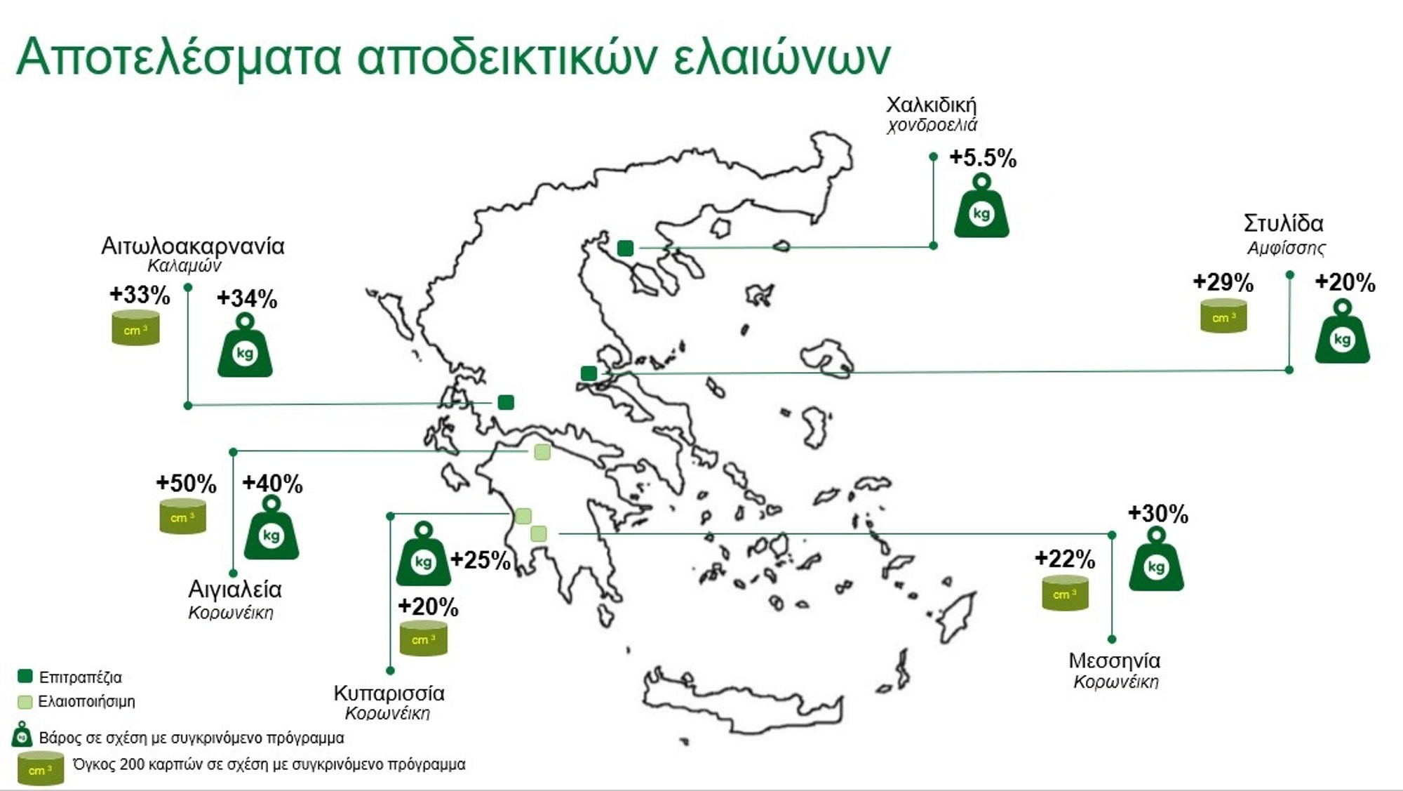 Στους τρεις πρότυπους ελαιώνες της Πελοποννήσου, είχαμε σημαντική αύξηση του βάρους των καρπών +40% (ελαιώνας Αιγιαλείας), +30% (ελαιώνας Μεσσηνίας) και +25% (ελαιώνας Κυπαρισσίας) και αντίστοιχα αύξηση του μεγέθους +50%, +22% και +20%.